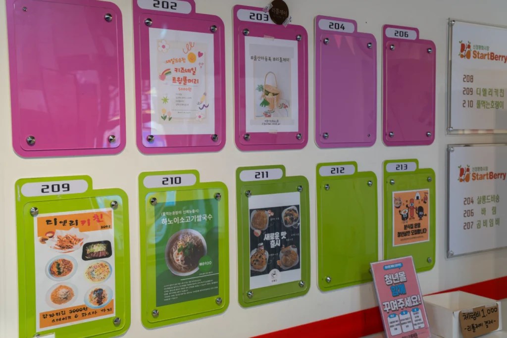 내부는 현재 인테리어 공사중인 식당들도 몇군데 있지만 전체적으로 밝고 깔끔한 분위기로, 환한 조명 아래에서 쾌적하게 식사를 즐길 수 있습니다. 특히 식당가에서 젊음의 향기가 물씬 풍기더군요. 벽면에는 각 매장의 메뉴와 음식 사진들이 있어 쉽게 메뉴를 정할수가 있었어요.