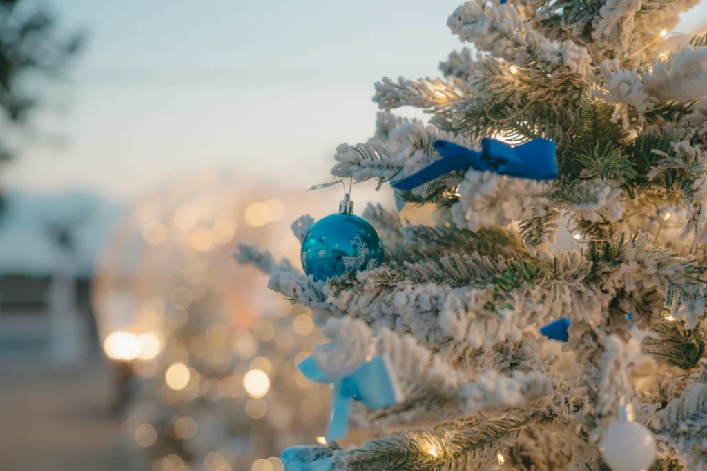 트리는 블루 리본 + 화이트톤 장식이라