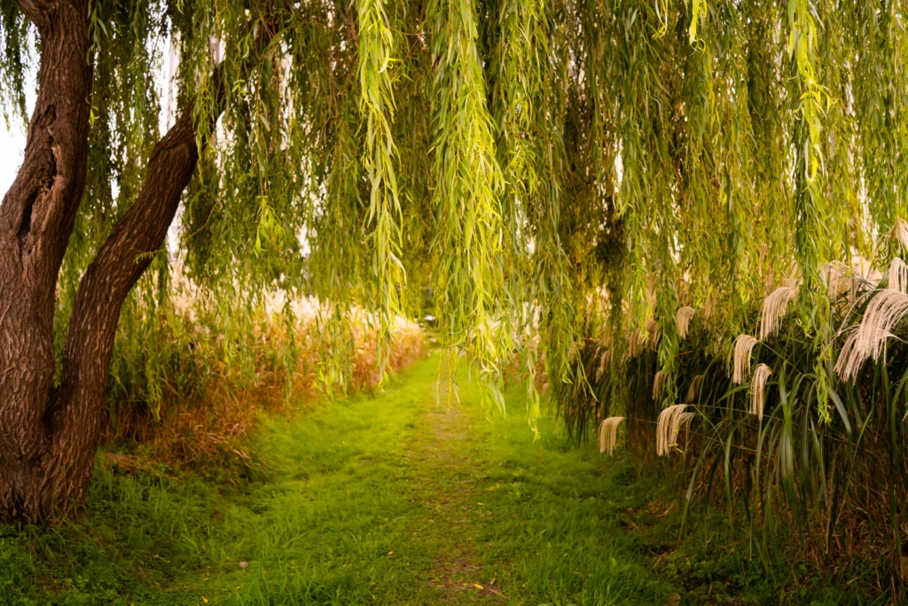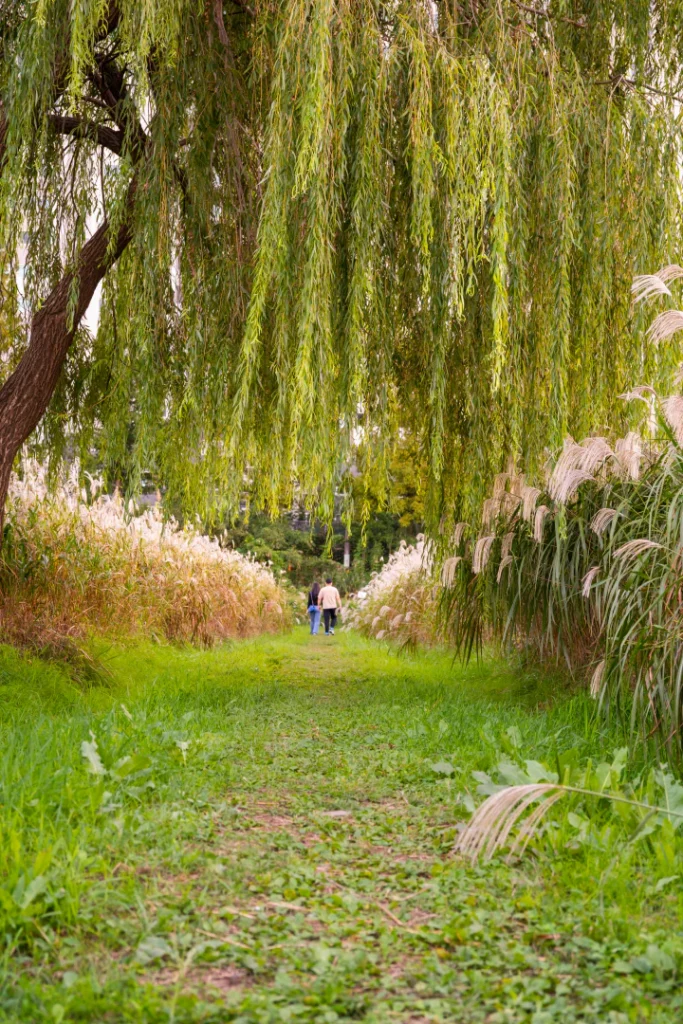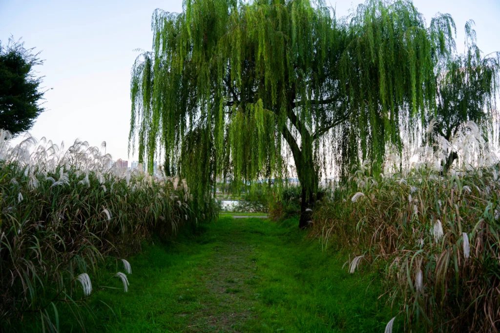 👉 큰 버들나무 한 그루 + 양옆으로 갈대숲 + 작은 샛길