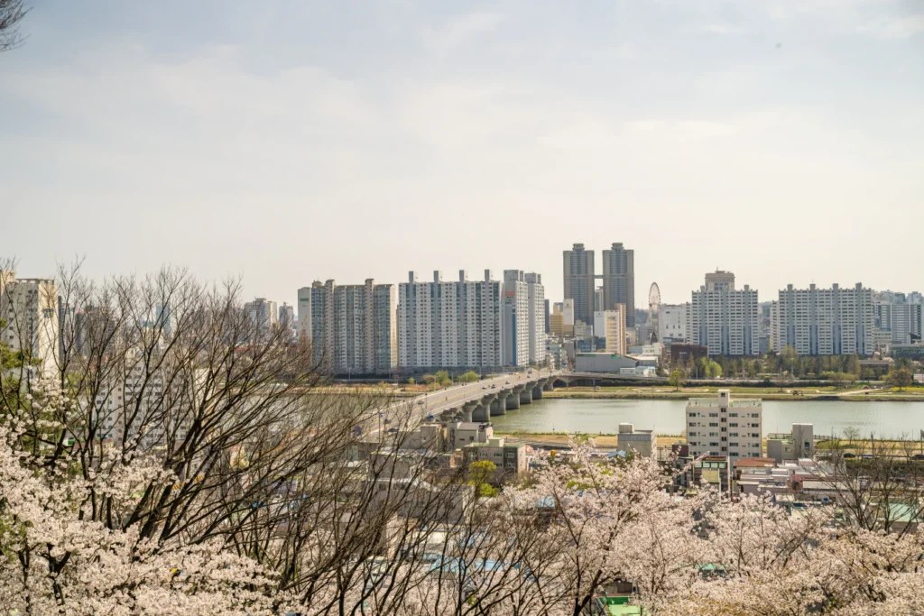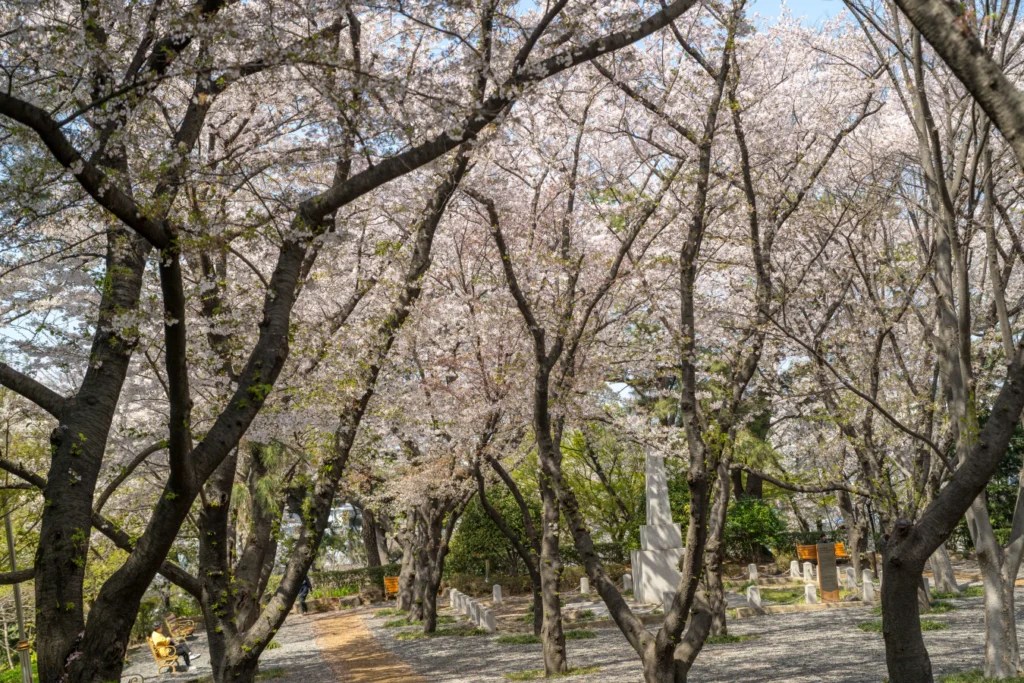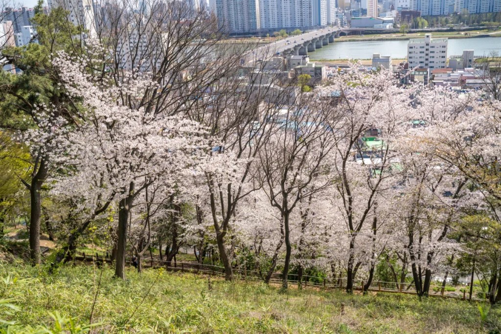 학성공원의 정상 부근은 또 다른 포토스팟입니다. 이 지점에서는 공원을 둘러싼 벚꽃나무들과 함께 울산 시내가 내려다보이는 전망을 배경으로 환상적인 사진을 찍을 수 있습니다.