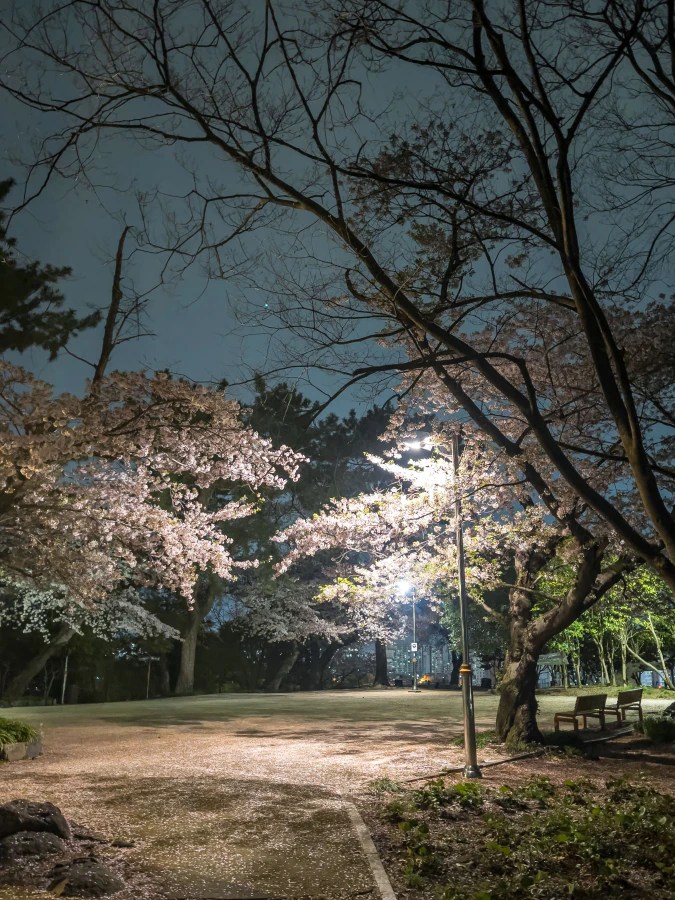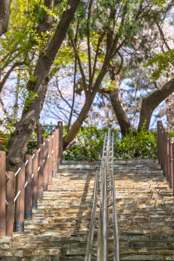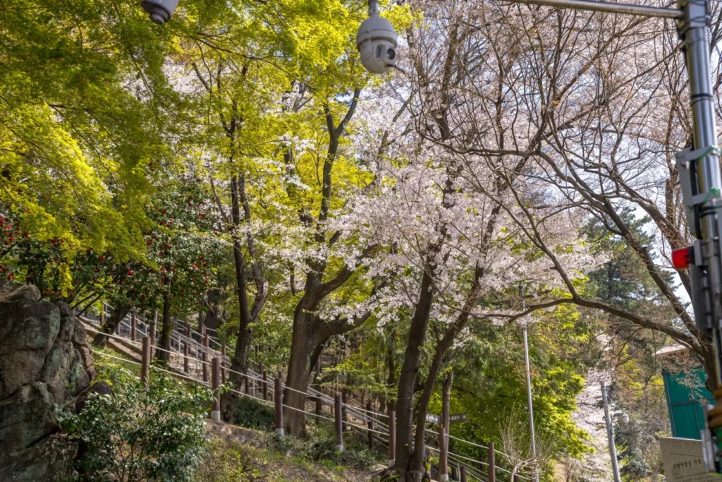 학성공원의 중앙 계단은 벚꽃나무로 둘러싸인 경로를 따라 올라가며 최고의 봄 사진을 남길 수 있는 스팟입니다. 계단 양 옆으로 흐드러지게 핀 벚꽃들이 관통하는 시각적 효과를 만들어, 마치 벚꽃 터널을 걷는 듯한 느낌을 주죠. 계단을 따라 올라가면서 다양한 각도에서 사진을 찍어보세요.