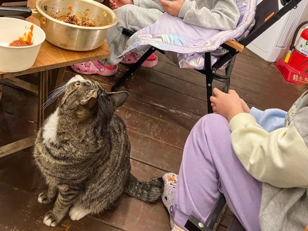 and while grilling, cats would sit nearby and wait patiently—very on brand.