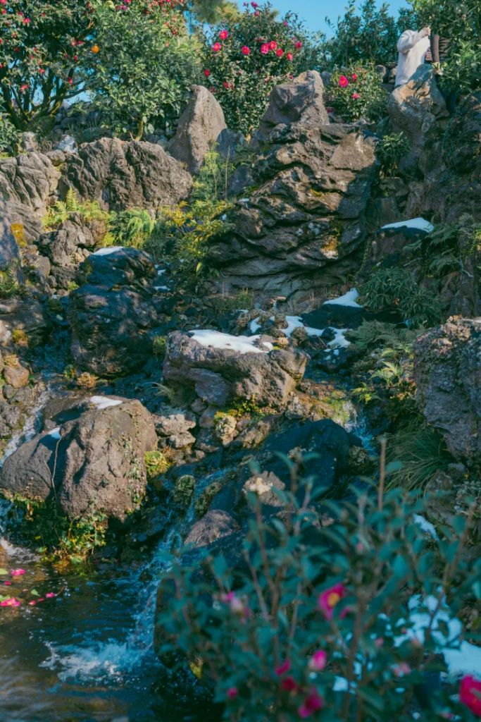 4️⃣ Camellias + Jeju Stone Walls = Perfect Combo 🪨