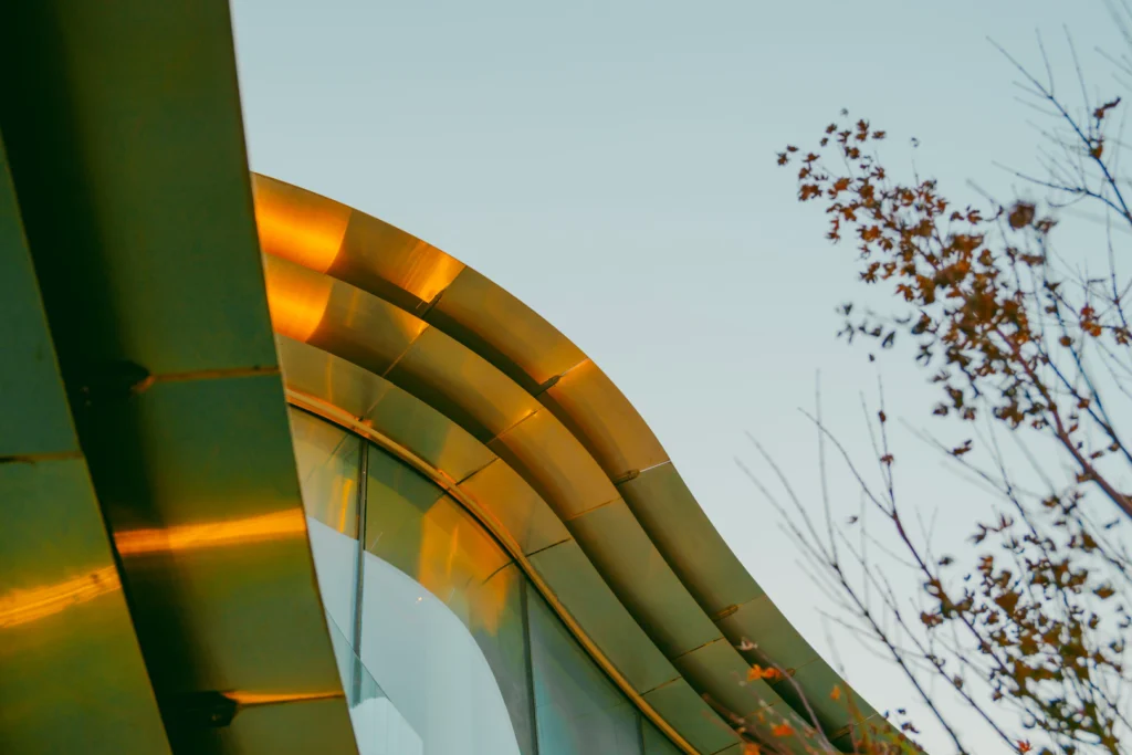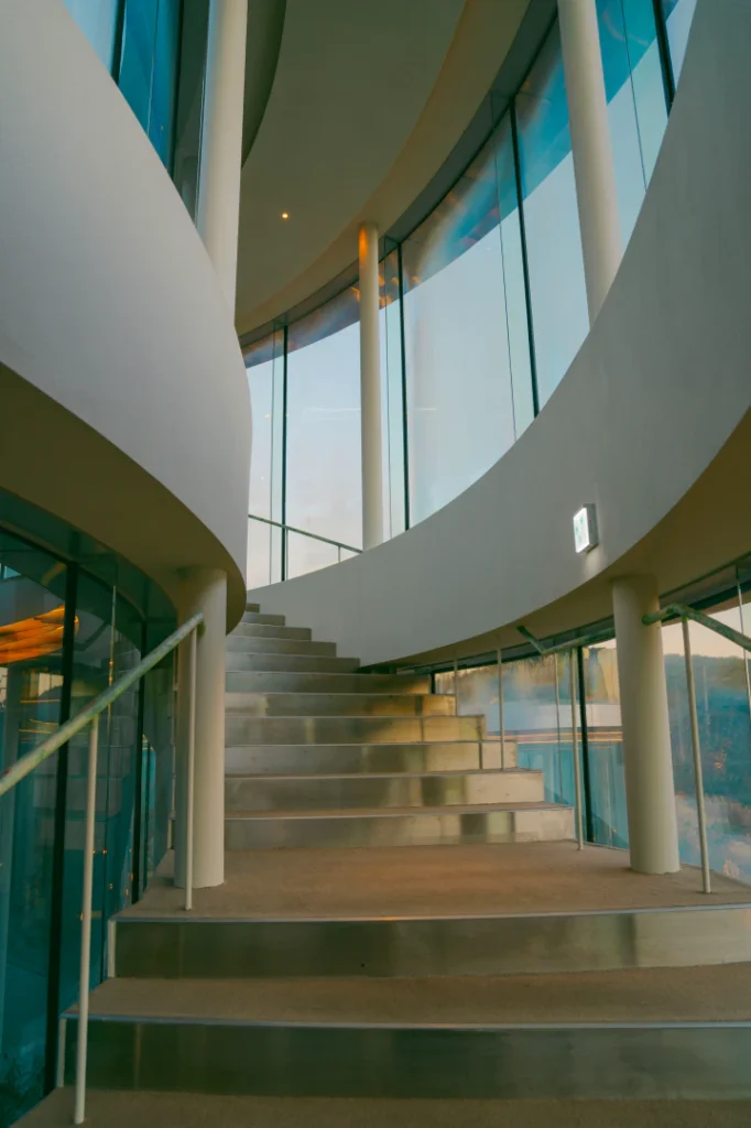Curved glass walls, terraced decks, and nature-centered design all make this place special.