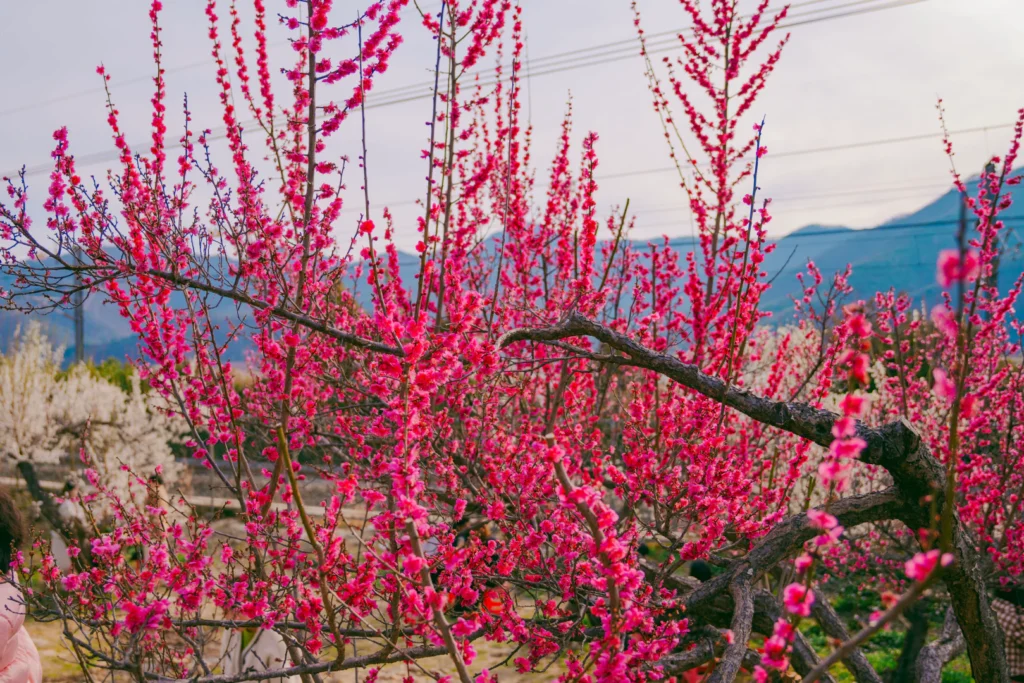 That layered landscape gives photos a completely different feel compared to most plum blossom spots.