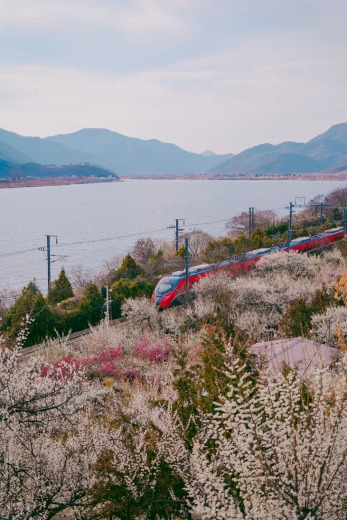 Nakdong River + railway + passing train + plum blossoms all in one frame.