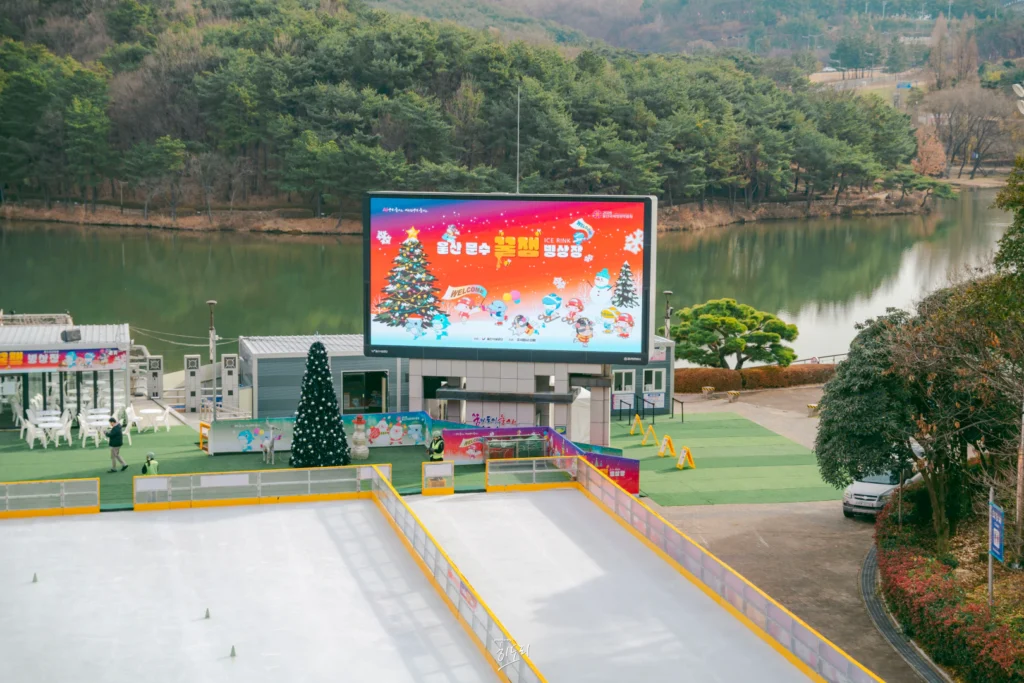 Ulsan ice rink, Ulsan skating rink, Ulsan winter activities, Ulsan sled park, family winter activities Ulsan, Munsu Lake Plaza, Ulsan with kids, Ulsan snow sled, Ulsan winter travel